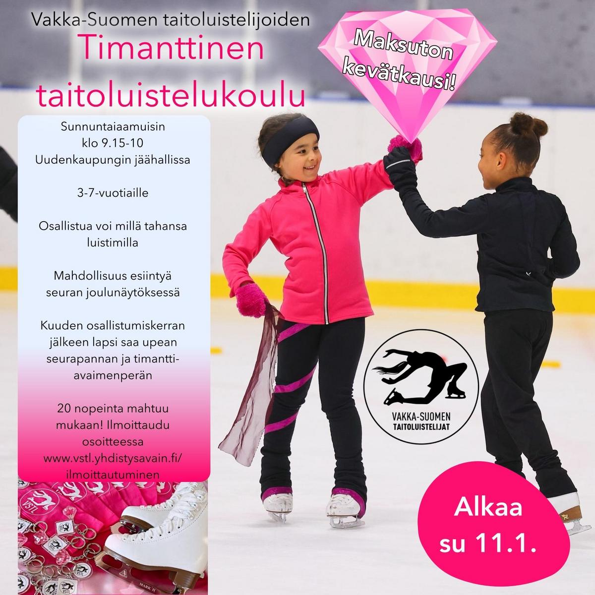Timanttinen taitoluistelukoulu on noin 3-7-vuotiaille lapsille suunnattu matalan kynnyksen harrastus, jossa opetellaan luistelun perustaitoja ja tutustutaan lajiin paljon pelien ja leikkien kautta. Aikaisempaa kokemusta luistelusta ei tarvitse olla ja jalkaan voi laittaa mitkä tahansa luistimet! Joskus iso jäähalli saattaa ympäristönä jännittää ensikertalaista, jolloin jäälle voi hyvin tulla myös oman aikuisen kanssa. Ilmoittaudu mukaan nettisivuilta kohdasta "ilmoittautuminen".